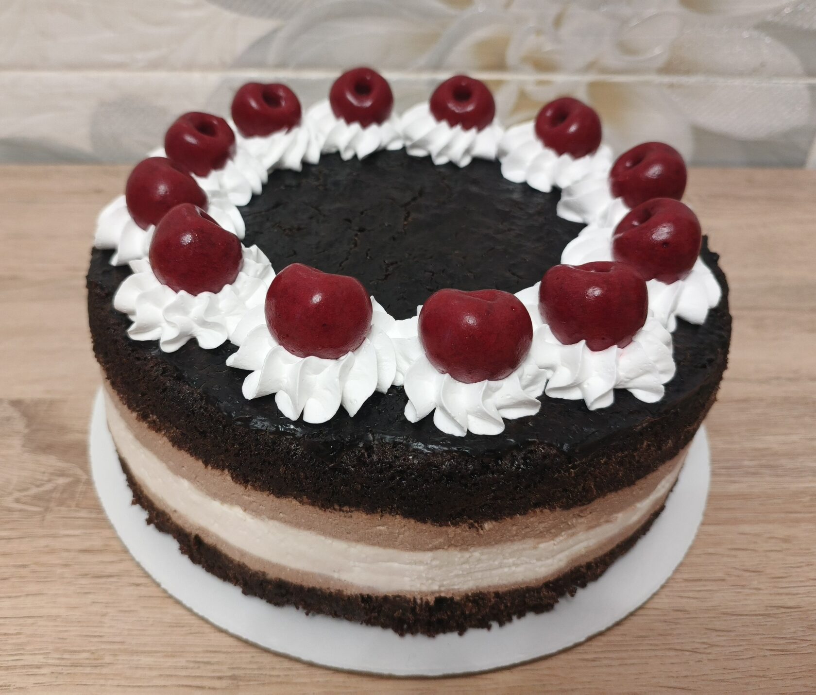 Насыщенный шоколадный бисквит. Крем сливочный с вишневой начинкой. Покрыт шоколадной помадкой и украшен по сезону свежей вишней или из мякоти вишни залитой в форму.